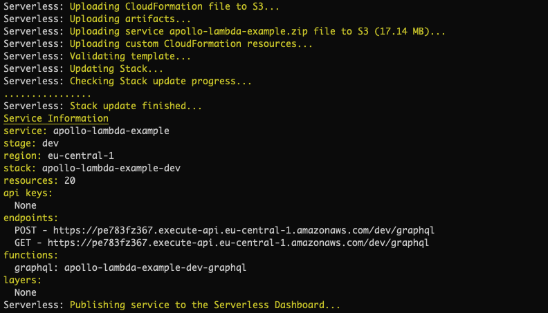 Now you can run sls deploy and the project gets packaged and deployed to AWS Lambda. Your output should look something like this: